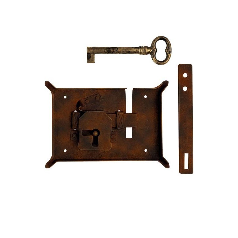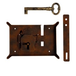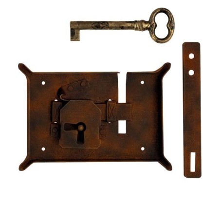 Serratura ferro anticato a scatola esterna entrata da 80-100 mm.con chiave ottone anticato.