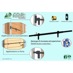 Spranga sicurezza ad espansione regolabile, da cm.95 a cm.123, finitura nero, diametro mm.22, con 2 staffe per legno + 2 pozzetti ottone per muro. Ideale per mettere in sicurezza finestre/porte.