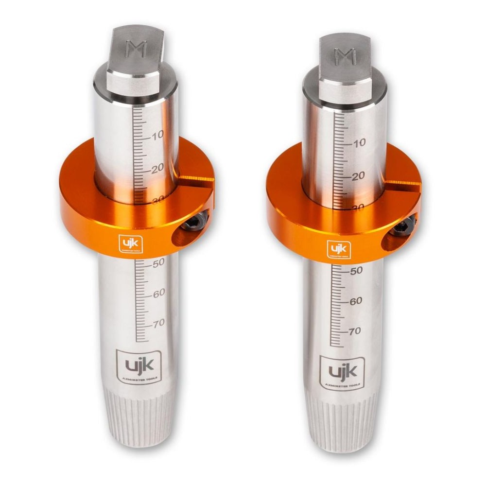 Sono forniti con due collari divisi in alluminio che si adattano al cane. Se il pezzo che stai tagliando è stretto, la guida può oscillare. Questi collari supportano il binario per fermare questo dondolio. I cani hanno una scala metrica di 75 mm lungo il lato. Questa scala viene utilizzata per misurare lo spessore del legno e quindi impostare il collare del cane allo spessore corretto per il supporto. Un'ultima caratteristica è la zigrinatura diritta sul cono principale. Questo aiuta quando si infila il bullone a T (che alloggia nella guida) al cane.