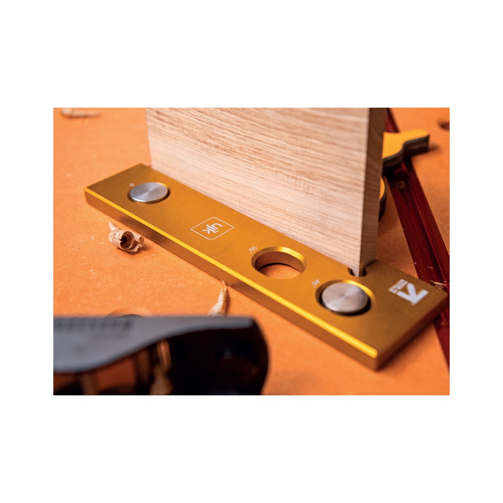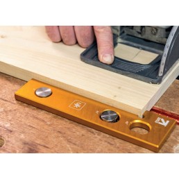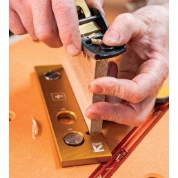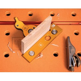 - Per piallare in verticale o con angoli di 45° utilizzando un banco MFT, con un foro circolare e 2 fori allungati per fori del banco da lavoro meno precisi. un foro circolare e 2 fori allungati per i fori del banco da lavoro meno precisi